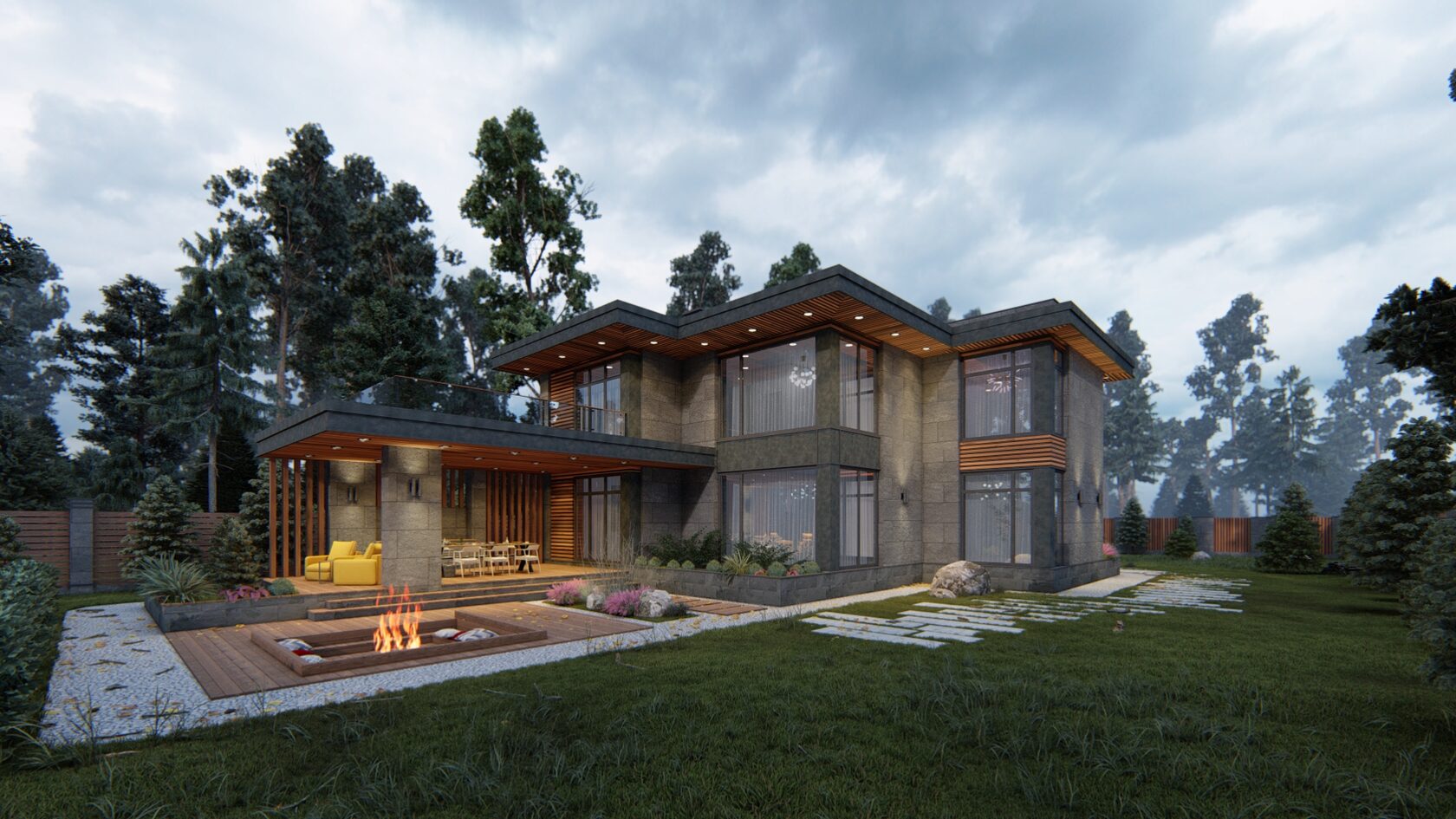 Двухэтажный дом с плоской кровлей и гаражом